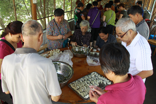 此次活動(dòng)共有120多名體協(xié)會(huì)員參加,大家都想借此機(jī)會(huì)和大自然來個(gè)親密接觸,體協(xié)委員利用休息時(shí)間為大家采購了豐富美味的食物。利用新世紀(jì)綠草地依山伴水的地理資源優(yōu)勢,在秋日和煦的陽光下,在風(fēng)景秀麗的南明湖邊,我們老年人在綠草地上展現(xiàn)了 “年輕人”舞步,跳著佳木斯健身操動(dòng)作,擺動(dòng)雙臂,邁開雙腳,走出健康,走出幸福。當(dāng)走進(jìn)餐廳看見桌子上擺好的餃子皮和餃子餡,老同志們便紛紛摩拳擦掌,躍躍欲試。他們各自分工后便熱火朝天的忙起來,現(xiàn)場笑聲不斷。