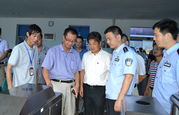 7月13日下午,市委常委、區(qū)委書記葛學斌、蓮都區(qū)公安局局長葉建利等領(lǐng)導(dǎo)在集團公司董事長葉茂的陪同下到客運東站調(diào)研護航G20安保工作情況。一行人經(jīng)過人物分離的安檢通道進入長途班車候車廳,在聽取東站經(jīng)理江小華介紹下親自體驗了客運東站新安裝的實名檢票系統(tǒng)。葛書記對客運東站的安保工作表示滿意,強調(diào)護航G20工作已經(jīng)進入臨戰(zhàn)階段,作為車站要切實加強出入安全檢查,扎實做好各項安保工作,堅決打贏“護航G20,平安奪金鼎”這場硬戰(zhàn)爭。