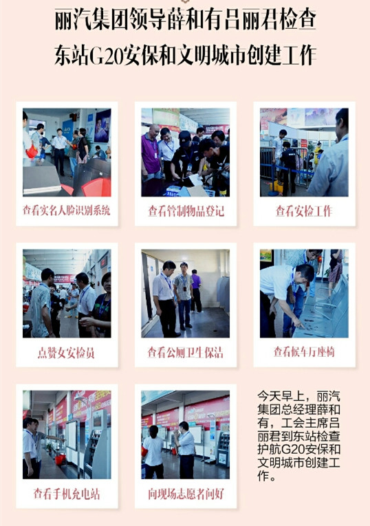今天上午,麗汽集團(tuán)總經(jīng)理薛和有、工會(huì)主席呂麗君到東站檢查護(hù)航G20 安保和文明城市創(chuàng)建工作。
