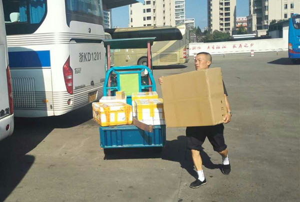 8月8日下午兩點,今天的天氣預(yù)報最高溫度是36℃,可是室外溫度依然高的可怕。東站行李房外,一輛永康班車迎面駛來,54歲的裝卸工胡瑞華立刻推著手推車迎了上去。車停穩(wěn)后,車上旅客紛紛下車跑向陰涼處,。對大部分人來說,這種太陽下面站著都吃不消更別說干活了??墒牵鹑A在太陽底下一件又一件地卸貨,認真干好本職工作沒有一絲怨言。今天貨有點多,卸了滿滿一車,好在胡瑞華技術(shù)嫻熟,不一會兒就卸完了,推著車走進行李房。雖說只有幾分鐘的功夫,但胡瑞華已是滿頭大汗。車推進行李房后,他對著電扇吹了幾下又接著開始安檢理貨入庫的工作了。