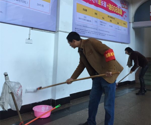 12月10日8:30,東站黨員志愿者在黨支部書記江小華的帶領(lǐng)下分別對站內(nèi)的墻面進(jìn)行刷白和衛(wèi)生死角的清掃。