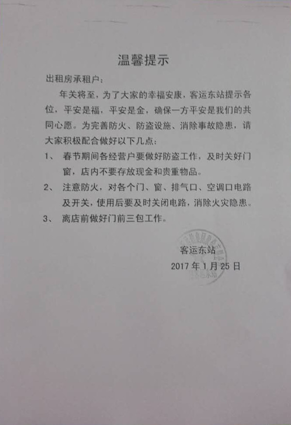 一行人對(duì)東站站場(chǎng)和出租房的消防設(shè)施、用火用電情況進(jìn)行了逐一檢查。要求工作人員加強(qiáng)安全防范,特別要注意春節(jié)期間的用火用電安全,下班后要及時(shí)切斷電源。并向周邊承租戶發(fā)出春節(jié)期間的溫馨提示,要求各承租戶在結(jié)束營(yíng)業(yè)后對(duì)店內(nèi)的用水、用電進(jìn)行仔細(xì)檢查,確保消除安全隱患,平平安安、快快樂樂的過春節(jié)。