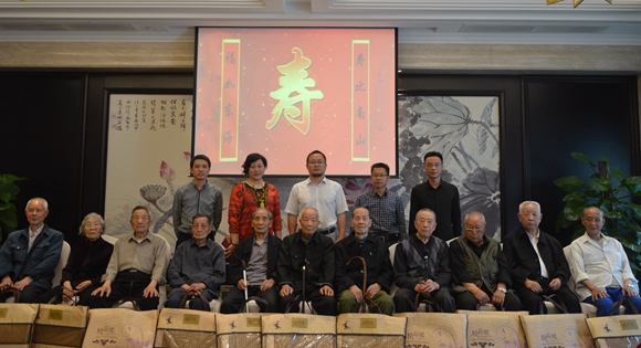 左邊是“福如東?!睂憹M衷心祝福,右邊為“壽比南山”送上美好祝愿,遒勁的“壽”正居中央。 5月4日,麗汽集團黨政工領(lǐng)導齊聚一堂,在蓮城賓館為70歲、80歲和90歲及以上老同志集體祝壽。