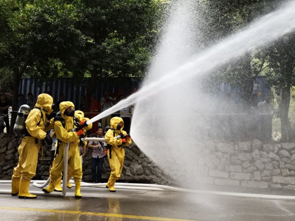演練模擬一輛大客車在危險(xiǎn)品運(yùn)輸罐車事故路段受阻,面對(duì)危險(xiǎn)品泄漏爆炸危險(xiǎn),道路運(yùn)輸工作人員立即組織乘客撤離危險(xiǎn)區(qū)域,及時(shí)上報(bào)險(xiǎn)情并采取安全處置措施,等待交警、消防員、醫(yī)護(hù)和環(huán)保測(cè)評(píng)等人員趕赴現(xiàn)場(chǎng)處理的過(guò)程。短短10多分鐘,20個(gè)場(chǎng)景的演練科目流程一氣呵成。演練場(chǎng)景驚險(xiǎn)逼真,扣人心弦,贏得了在場(chǎng)觀演人員和群眾的一致好評(píng)。