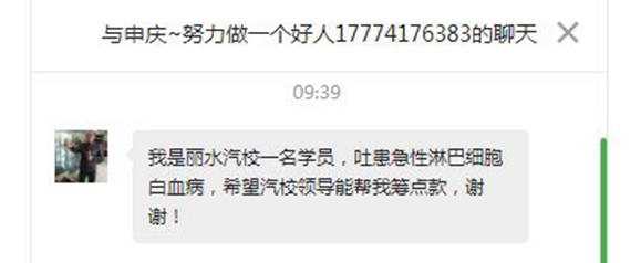 6月27日,麗汽集團汽車技術(shù)學(xué)校的微信公眾號收到一條來自學(xué)員的消息:“我是麗汽汽校的一名學(xué)員,突患急性淋巴細(xì)胞白血病,希望汽校領(lǐng)導(dǎo)能幫我籌點款,謝謝!”