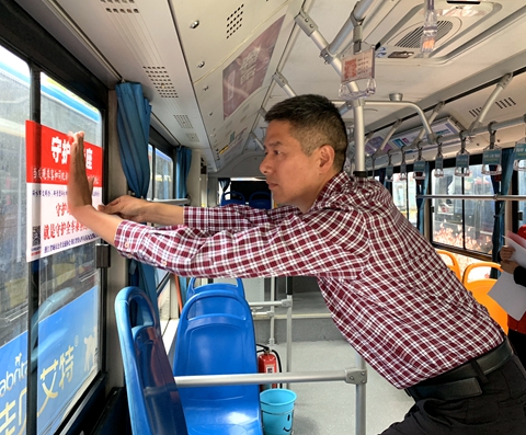 集團公司副總經(jīng)理林周穎參加了公益活動,并為公交車張貼“守護員專座”標志。