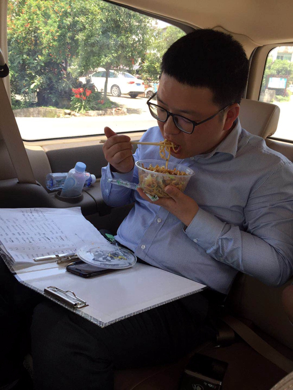 時間在忙而有序中過了飯點,注重細節(jié)的他,卻無暇顧及了自己的午飯,還是身邊的同事提醒到吃飯了,他才想起了這個茬。沒見他收拾收拾準備下班,而是一頭鉆進了車后座,端起了一碗早已冷卻的外賣炒面,扒拉了起來,眼睛卻一直離不開懷里的工作簿。同事打趣地說:勇哥,今天上班賺了加班費,還吃的這么省???引起一片哄笑……高勇抬起頭笑了笑,“冷面好吃!我得趕緊吃完,客人還等著我送發(fā)票呢!”
