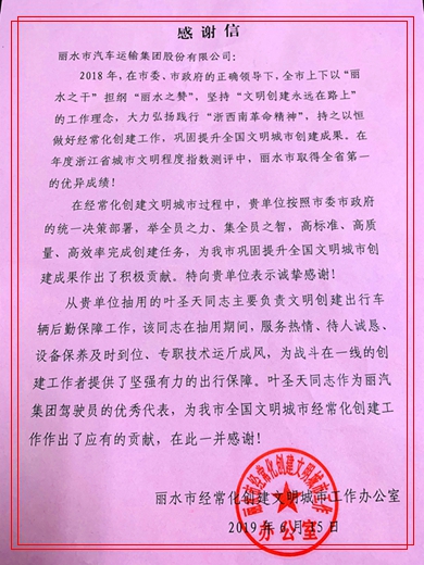 信中還特別表揚(yáng)了從集團(tuán)公司抽用的葉圣天同志,在工作中服務(wù)熱情、待人誠(chéng)懇、設(shè)備保養(yǎng)及時(shí)到位、專職技術(shù)運(yùn)斤成風(fēng),為戰(zhàn)斗在一線的創(chuàng)建工作者提供了堅(jiān)強(qiáng)有力的出行保障。葉圣天同志作為麗汽集團(tuán)抽用的、主要負(fù)責(zé)文明創(chuàng)建出行車輛后勤保障工作的優(yōu)秀駕駛員代表,為我市全國(guó)文明城市經(jīng)?;瘎?chuàng)建工作作出了應(yīng)有的貢獻(xiàn)。