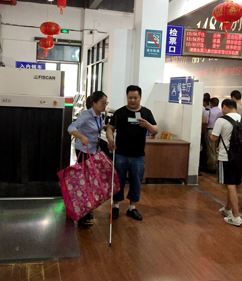 盲人旅客聽著劉遠(yuǎn)玲走開的聲音,很激動(dòng)的對我說:“你們站的工作人員真好,從我一進(jìn)車站就過來扶著了?,F(xiàn)在又幫忙買票。真好,真好……”話剛落,劉遠(yuǎn)玲買好票遞了過來,“13:06分了,你先幫他把票檢了,我現(xiàn)在扶他出去等車,這樣時(shí)間剛剛好?!?br/> 只見劉遠(yuǎn)玲扶著盲人旅客慢慢走出候車室,等待車子進(jìn)站停穩(wěn),又跟駕駛員師傅一起把盲人旅客扶上了車,安排在了最靠近下車門的位置,系好安全帶,交代了幾句,才放心的走下車來。我打趣到:“美女,累不累?”劉遠(yuǎn)玲笑著說:“我怎么會(huì)累,是他們這些特殊的旅客,出門不方便,真的會(huì)很累,我們能多幫到一位,就多一份安心!”