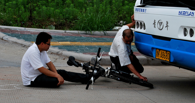場(chǎng)景二:模擬一輛快客班車滿載旅客從客運(yùn)西站發(fā)車,行駛在公路上,由于一輛騎自行車人從右向左突然橫穿,駕駛員采取避讓和制動(dòng)措施不及,與自行車發(fā)生碰撞,導(dǎo)致騎車人受傷倒地。駕駛員立即停車查看騎車人受傷情況,打110報(bào)警和打120急救,將事故情況報(bào)告至快客公司,設(shè)置好現(xiàn)場(chǎng)警示牌,勸導(dǎo)下車的旅客回車內(nèi),快客公司安排車輛前往事故地點(diǎn)進(jìn)行駁客,同時(shí)快客公司分管安全的經(jīng)理和安全員一起前往事故現(xiàn)場(chǎng)。交警到達(dá)現(xiàn)場(chǎng),進(jìn)行事故現(xiàn)場(chǎng)勘查;120急救車到達(dá)現(xiàn)場(chǎng),帶走受傷騎車人;快客公司分管安全的經(jīng)理和安全員到達(dá)事故現(xiàn)場(chǎng);駁客車到達(dá)現(xiàn)場(chǎng),將事故車輛乘客駁走。