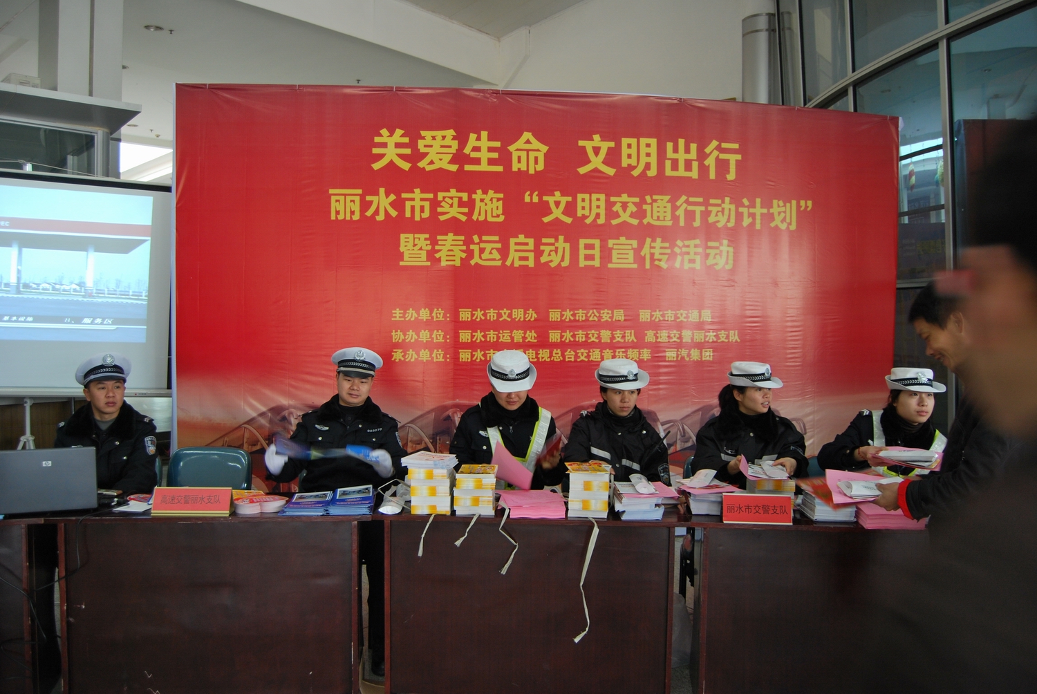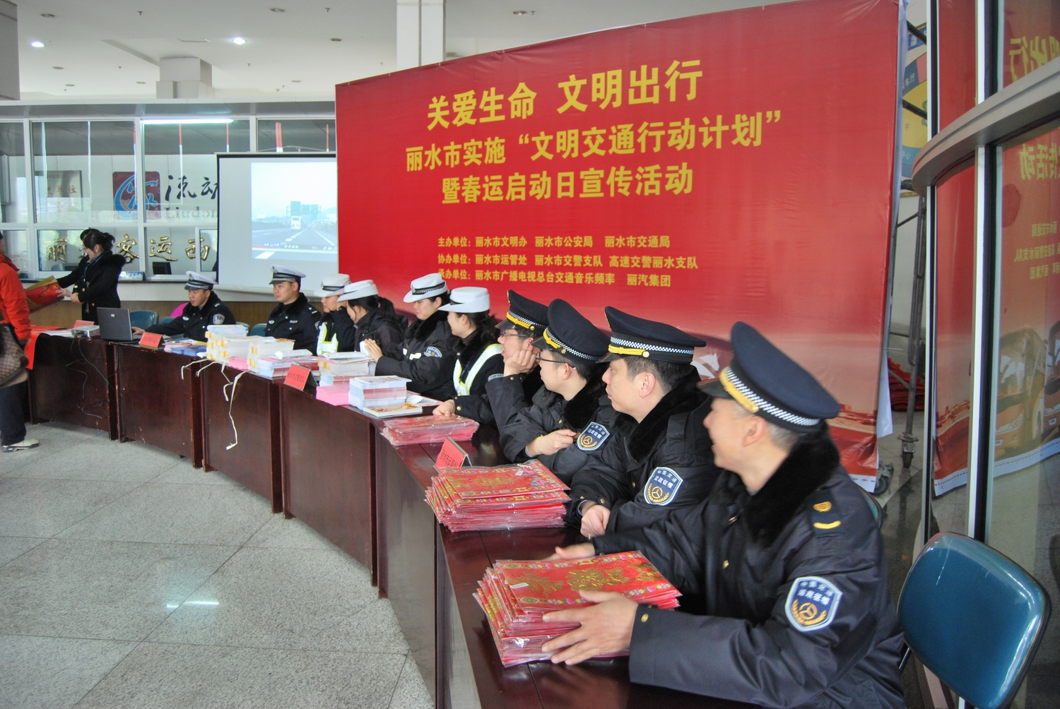 春運首日,由麗水市文明辦、麗水市公安局、麗水市交通局主辦,麗水市運管處、麗水市交警支隊、高速交警麗水支隊協(xié)辦,麗水電臺交通音樂頻率、麗汽集團承辦的 關愛生命 文明出行 麗水市實施“文明交通行動計劃”暨春運啟動日宣傳活動在麗水客運西站舉行。