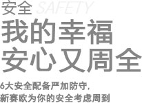 安全安全籠式車身、井字鋼梁、潰縮空間設(shè)計(jì) 4輪29次安全碰撞測(cè)試,以國(guó)際安全標(biāo)準(zhǔn)呵護(hù)您的旅程 ABS+EBD、五座標(biāo)準(zhǔn)安全帶(前排帶預(yù)張緊功能) 全系標(biāo)配雙安全氣囊、安全碰撞可潰縮吸能轉(zhuǎn)向柱 后排車門(mén)兒童安全鎖和后排IS0FIX兒童安全座椅固定裝置 行人保護(hù)安全車頭雙翼區(qū)