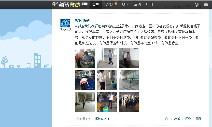 根據(jù)麗水市創(chuàng)建國(guó)家衛(wèi)生城市工作領(lǐng)導(dǎo)小組辦公室《關(guān)于利用微博做好創(chuàng)衛(wèi)宣傳工作的通知》,麗水客運(yùn)西站積極響應(yīng),并與8月21日在客運(yùn)西站騰訊微博賬戶開通“創(chuàng)衛(wèi)我們?cè)谛袆?dòng)”專欄和“健康知識(shí)”專欄。