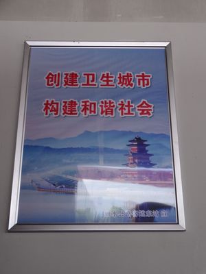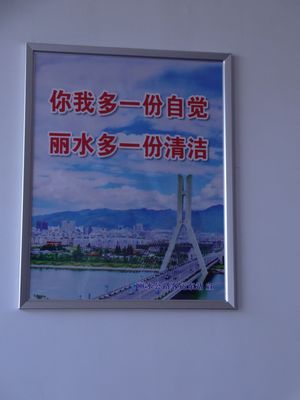 現(xiàn)在,墻上懸掛的是創(chuàng)衛(wèi)口號與麗水山水風(fēng)光相結(jié)合的宣傳畫,賞心悅目。