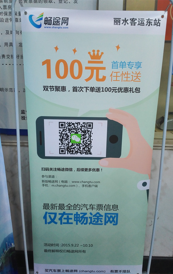 中秋、國(guó)慶即將來(lái)臨,為了方便旅客購(gòu)票,從9月22日至10月10日,客運(yùn)東、西兩站和暢途網(wǎng)開(kāi)展了“慶中秋、迎國(guó)慶”網(wǎng)絡(luò)購(gòu)票送優(yōu)惠活動(dòng),首次下單送100元優(yōu)惠禮包(100元=50*1+20*1+10*2+5*2;每張優(yōu)惠券有效期90天,共計(jì)6張券)。詳見(jiàn)兩戰(zhàn)售票廳海報(bào)。