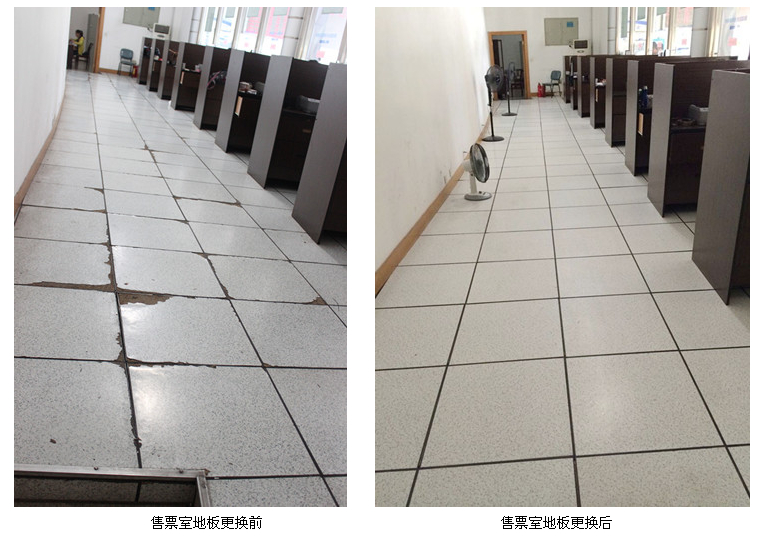 客運(yùn)西站主樓一層售票室和消防監(jiān)控室的防靜電地板因使用多年,破損嚴(yán)重,影響了西站整體的美觀。為了保持西站良好的窗口形象和符合創(chuàng)建國(guó)家衛(wèi)生城市的要求,近日,西站對(duì)售票室和消防監(jiān)控室的防靜電地板進(jìn)行更新。