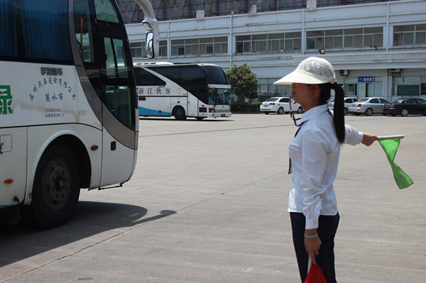 正午時分,行車員們頂著烈日,揮動著紅綠旗,認(rèn)真地為車輛引航,安全及時地送出一撥撥旅客。愛美之心人皆有之,行車組的姐妹們也不例外,可是為了發(fā)車安全,一件長袖襯衫、一頂遮陽帽就是她們面對毒辣太陽的全副武裝。