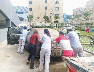 8月21日凌晨5點(diǎn),公司微信事故群就滴滴的開始叫喚,這時候水東片區(qū)的水位已經(jīng)基本恢復(fù)原位,馬路上堆滿了水位退去的生活垃圾、沼泥,空氣中彌漫著災(zāi)后的油臭味。他們又開始了忙碌的一天,今天的任務(wù)是先將客戶車輛安全的轉(zhuǎn)移到可轉(zhuǎn)移點(diǎn),男生們負(fù)責(zé)體力活,推車?yán)?,銷售部的女生們負(fù)責(zé)守點(diǎn)看車,聯(lián)系客戶。