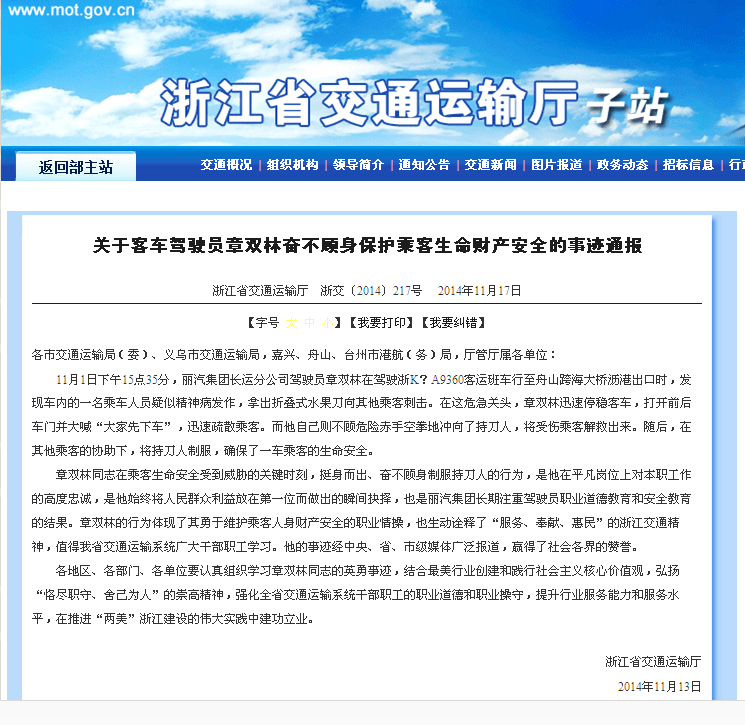 省交通運(yùn)輸廳發(fā)出章雙林事跡通報(bào) 號召全省交通運(yùn)輸系統(tǒng)干部職工學(xué)習(xí)