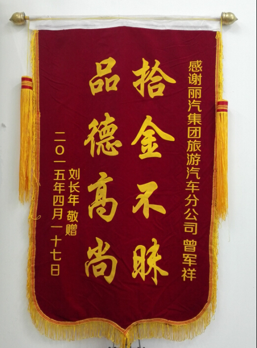 旅客劉長年回顧說,自己在4月15日來麗水市委黨校開會(huì),會(huì)議包的是麗汽集團(tuán)旅游汽車分公司的車。晚上會(huì)議結(jié)束以后就直接下車了,當(dāng)時(shí)也沒有留意自己的錢包丟在車上,后來到了賓館才發(fā)現(xiàn)自己錢包丟了,十分的著急,因?yàn)樽约菏侨A僑,包里面的很多卡十分的重要,而且補(bǔ)辦起來很困難。后來問了經(jīng)辦人才得知駕駛員的電話。第2 天來到麗汽集團(tuán)旅游汽車分公司的時(shí)候,發(fā)現(xiàn)自己的錢包已經(jīng)安安全全的放在前臺(tái)工作人員那里了。我當(dāng)時(shí)拿了500塊錢想感謝駕駛員,但是好心的駕駛員婉言拒絕了,就說了句“這是應(yīng)該做的”。我想想還是做點(diǎn)實(shí)際的來表示我對(duì)這位拾金不昧、品德高尚的駕駛員的謝意,所以就送上了這面錦旗。