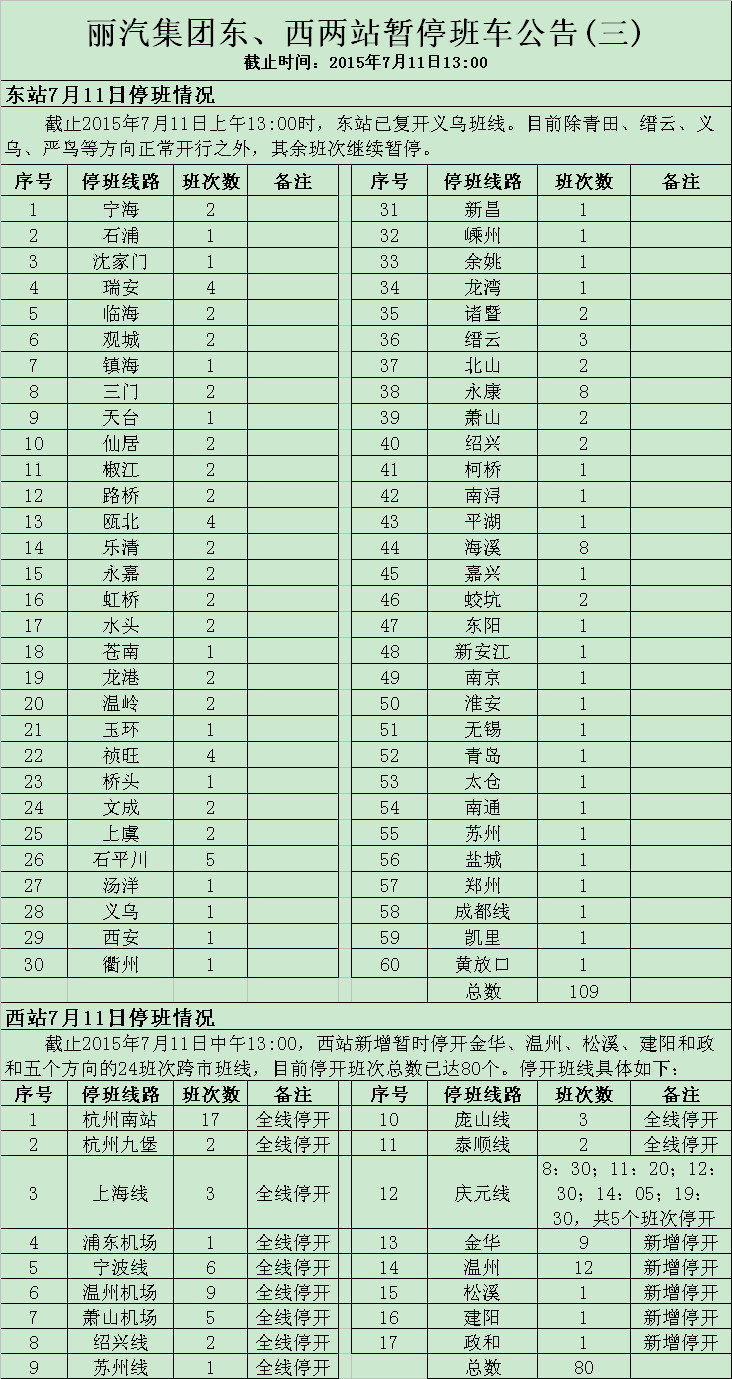 截止7月11日13:00,麗汽集團(tuán)東、西兩站班車(chē)停復(fù)班情況: